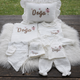 Set İçeriği: Fırfırlı kenar detaylı, dolgulu müslin yastık Ön işlemeli, arkadan çıtçıtlı müslin tulum Müslin bonet Fırfırlı müslin battaniye Tüm parçalar aynı tema ve renk uyumu ile hazırlanmış olup, isme özel nakış detayıyla kişiselleştirilmektedir. Fırfır detayları sete zarif ve romantik bir görünüm kazandırırken, müslin kumaş bebeğinizi nazikçe sarar. 🎀 Ürün...
